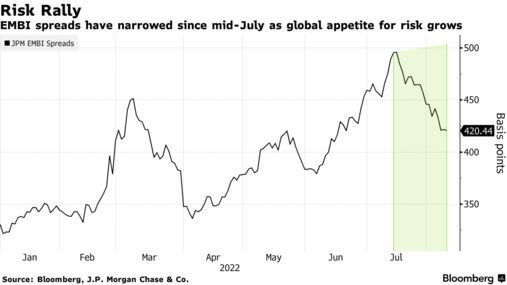 美国最新的通胀数据使投资者减少了对美联储收紧政策的押注,引发风险资产出现上涨。周三,新兴市场主权债相对美国国债的利差收窄,延续了自7月中旬以来摩根大通指数利差触及两年多新高后的走势。