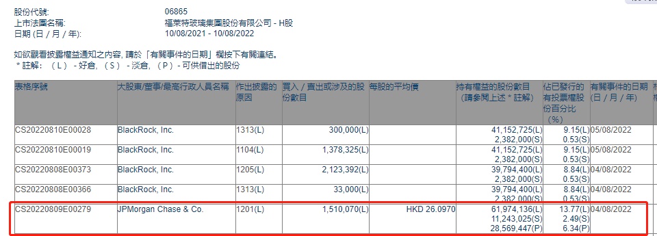 智通财经APP获悉,香港联交所最新资料显示,8月4日,小摩减持福莱特玻璃(06865)151.007万股,每股作价26.097港元,总金额约为3940.83万港元。减持后最新持股数目约为6197.41万股,最新持股比例为13.77%。