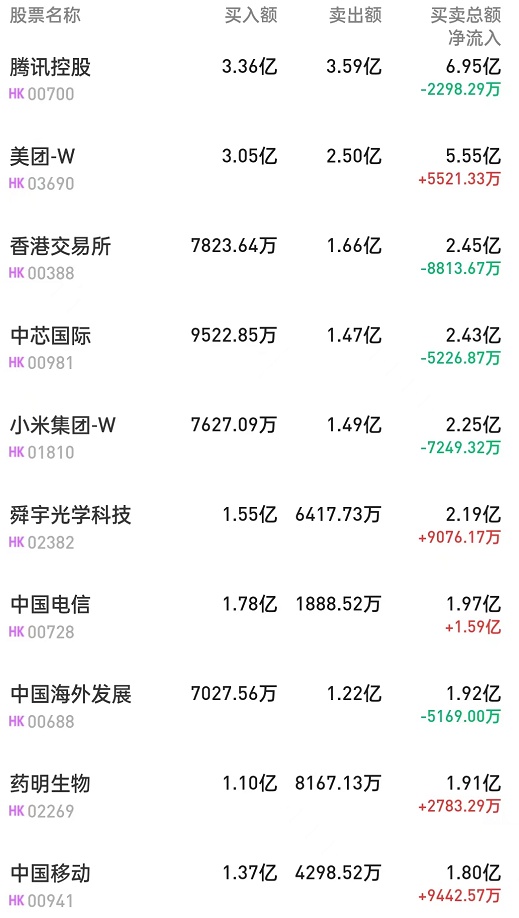 北水净买入最多的个股是美团-W(03690)、舜宇光学(02382)、中国电信(00728)。北水净卖出最多的个股是港交所(00388)、中国海外发展(00688)、中芯国际(00981)。
