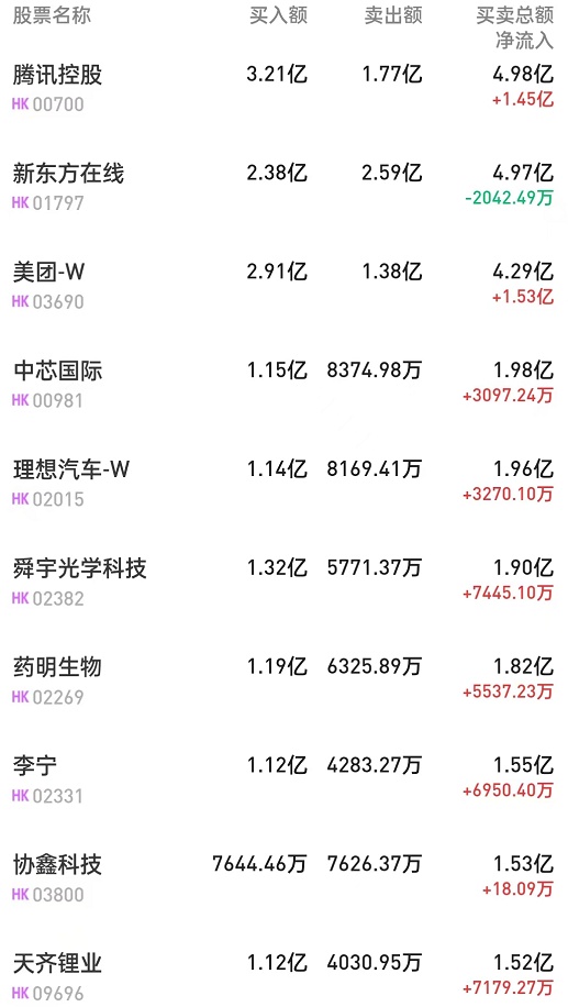 李宁(02331)获净买入6950万港元。消息面上,中泰证券纺服行业7月电商数据报告显示,从阿里平台看,各品类线上GMV同比均有所下降。抖音平台各品类头部品牌则取得靓眼增长。申万宏源则表示,展望下半年及明年,低基数效应叠加终端消费复苏,业绩仍有提速空间,PEG角度看板块具备较高性价比,继续看好国产运动品牌的长期成长空间。