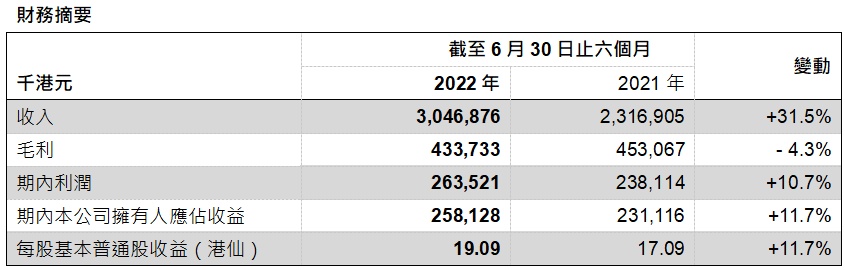 回顾期内,集团整体收入较2021年同期上升约31.5%至约3,046.8百万港元(2021年上半年:约2,316.9百万港元)。由于供暖期内天然气采购成本的上升,集团之毛利较2021年下降约4.3%至约433.7百万港元(2021年上半年:约453.1百万港元),而整体毛利率与去年同期相比亦有所下降至约14.2%。期内,由于应收账款减值转回净额的增加以及递延所得税费用减少,公司拥有人应占溢利上升约11.7%至约258.1百万港元(2021年上半年:约231.1百万港元);每股基本盈利增加2港仙至约19.09港仙(2021年上半年:约17.09港仙)。