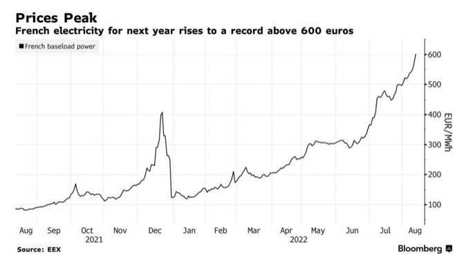数据显示,德国明年交付的基准电力价格一度上涨4.5%,达到创纪录的446欧元/兆瓦时。法国明年交付的电力价格则上涨4.4%,首次突破600欧元。
