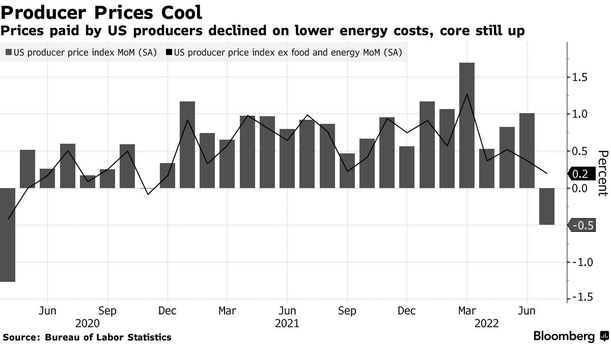 由于能源成本下降,美国生产商支付的价格有所下降,但核心价格仍在继续上涨。剔除波动性较大的食品和能源成分,所谓的核心PPI较6月份上涨0.2%,较上年同期上涨7.6%。总体和核心数据都明显低于市场预期。