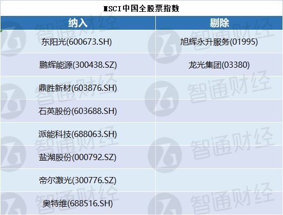 MSCI中国全股票指数新纳入8个成分股,其中包括鹏辉能源(300438.SZ)、鼎胜新材(603876.SH)、石英股份(603688.SH)等,剔除2个成分股。