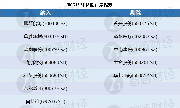 MSCI中国A股在岸指数新纳入7个成分股,其中包括鹏辉能源、鼎胜新材、盐湖股份、派能科技等,剔除5个成分股。