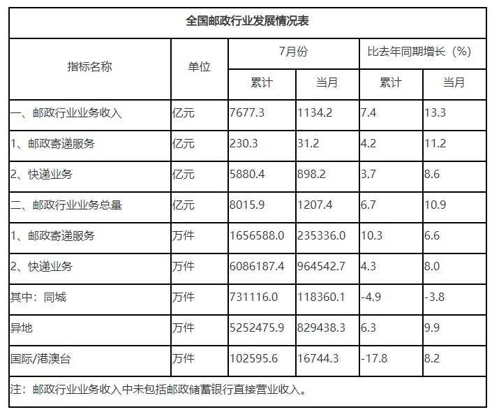 7月份,邮政服务业务总量完成156.4亿元,同比增长5.2%;邮政寄递服务业务量完成23.5亿件,同比增长6.6%;邮政寄递服务业务收入完成31.2亿元,同比增长11.2%。