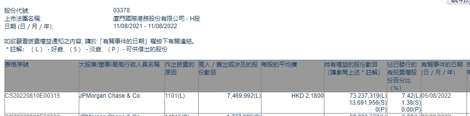 智通财经APP获悉,香港联交所最新资料显示,8月5日,小摩增持厦门港务(03378)746.9992万股,每股作价2.18港元,总金额约为1628.46万港元。增持后最新持股数目约为7323.73万股,最新持股比例为7.42%。