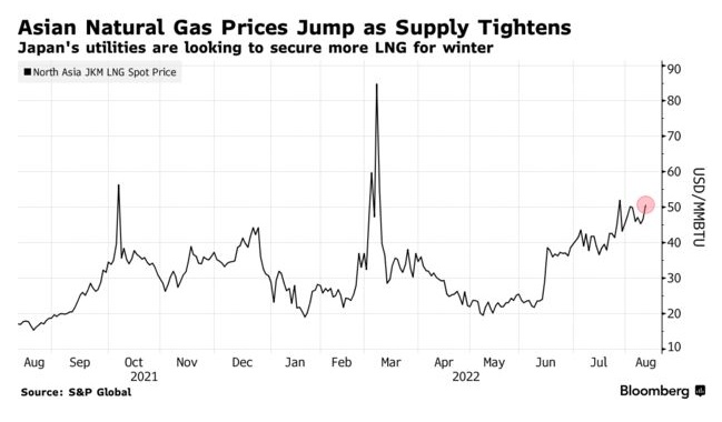 亚洲LNG基准现货价格本周大幅上涨,但仍较3月初创下的纪录低近70%,当时俄乌冲突的影响颠覆了市场。据了解内情的交易员称,过去一周,几家日本公用事业公司加快了与供应商的谈判,准备为冬季采购更多的货物。
