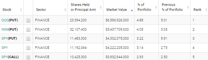iShare罗素2000指数ETF看跌期权位列第二,持仓约3210.7万股,持仓市值约为54.38亿美元,占投资组合比例为4.05%。