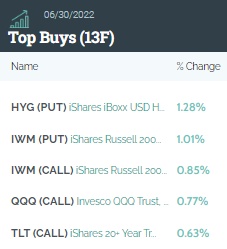从持仓比例变化来看,前五大买入标的分别是:iShares iBoxx 美元高收益公司债券 ETF 看跌期权、iShare罗素2000指数ETF看跌期权、iShare罗素2000指数ETF看涨期权、纳指100ETF看涨期权、iShares 20 年以上国债 ETF 看涨期权。