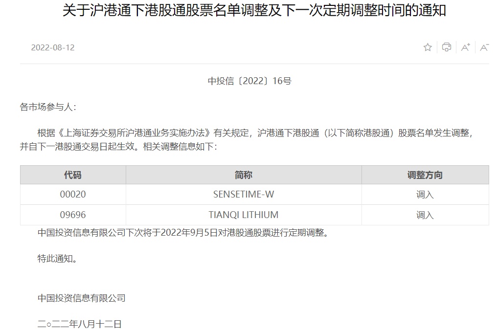 智通财经APP获悉,8月12日,上交所发布关于沪港通下港股通股票名单调整及下一次定期调整时间的通知。通知提到,根据相关规定,沪港通下港股通股票名单发生调整,调入商汤-W(00020)、天齐锂业(09696),并自下一港股通交易日起生效。