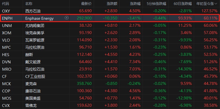 今年以来,Enphase Energy的累计涨幅为60.11%,在标普500指数成分股中高居第二,仅次于西方石油(OXY.US),表现好于埃克森美孚(XOM.US)、赫斯(HES.US)、雪佛龙(CVX.US)等众多专注于石油和天然气业务的能源股。这让人不禁想问,Enphase Energy为什么能在众多能源股和太阳能股中有如此不俗的表现?