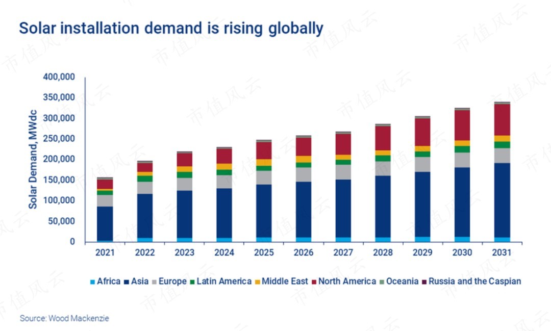 目前清洁能源市场的趋势表明,对太阳能光伏系统的需求将会激增。全球能源和金属行业最权威的咨询机构Wood Mackenzie最新预测,2022年光伏新增装机量同比增长25%至197GW,累计装机量将超过1000GW。该机构还预计,未来十年全球光伏装机量平均复合年增长率为8%,到2031年,全球总装机容量将达到3500GW。对于美国太阳能市场来说,气候投资法案将会进一步推高其光伏装机量。