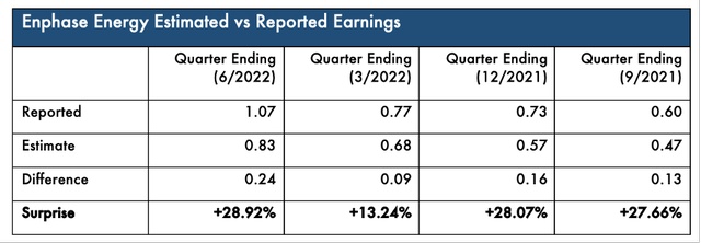 Enphase Energy的业绩总是能给人带来惊喜。7月底公布的第二季度财报显示,Enphase Energy营收达5.30亿美元,同比增长68%、环比增长20%。经调整的摊薄后每股收益为1.07美元,较市场预期超出29%。值得一提的是,这并不罕见。在过去四个季度,Enphase Energy的每股收益都以较大幅度超出市场预期。