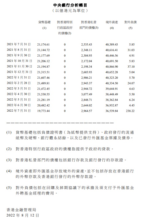 智通财经APP获悉,香港金融管理局(金管局)今日(8月12日)公布外汇基金在2022年7月底的主要分析帐目。在7月份,外汇基金的境外资产减少393亿港元,至36540亿港元。