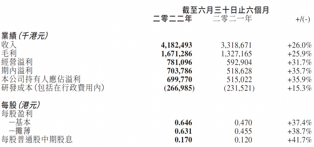 百富环球半年报显示,今年上半年公司实现收入41.82亿港元,同比增长26%;归母净利润7亿港元,同比劲增35.9%。此外,公司还计划于9月16日派发中期股息每股0.17港元。