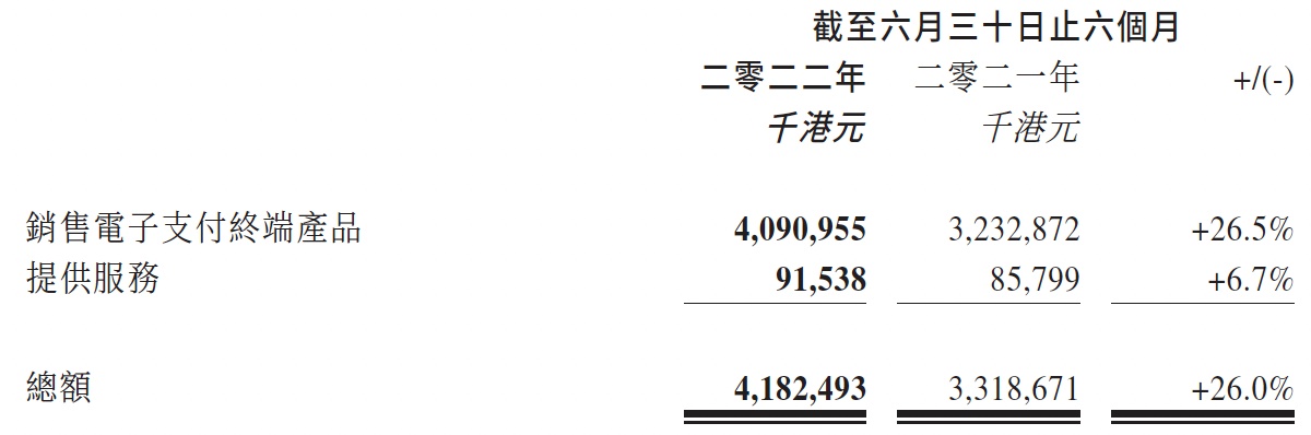 拆分收入结构,上半年百富环球销售电子支付终端产品和提供服务业务均取得较好增速表现。其中,销售电子支付终端产品实现收入40.91亿港元,占公司收入比重的97.8%,规模同比增加26.5%;同期,公司提供服务业务实现收入9153.8万港元,占比2.2%,规模同比提升6.7%。