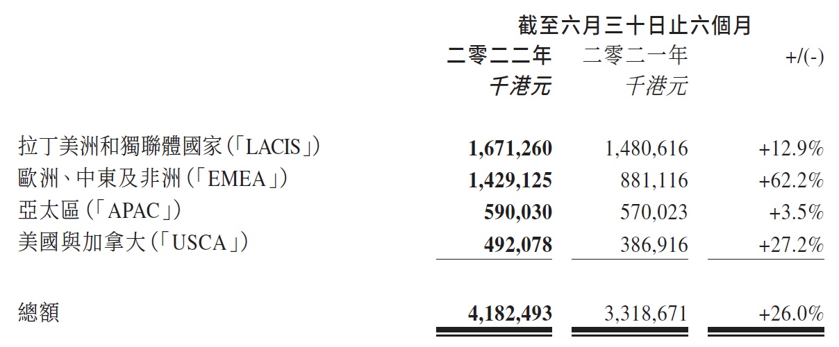 分地域来看,LACIS(拉丁美洲和独联体国家)依然是百富环球最主要的收入来源地,报告期内公司来源于该地区的收入为16.71亿港元,同比增长12.9%。