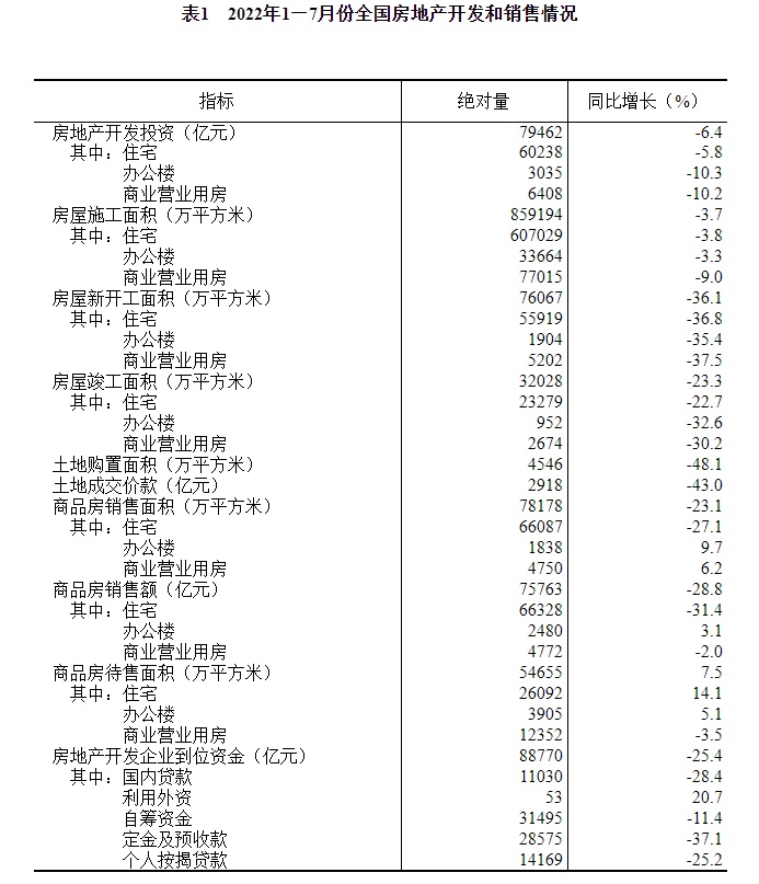1—7月份,房地产开发企业房屋施工面积859194万平方米,同比下降3.7%。其中,住宅施工面积607029万平方米,下降3.8%。房屋新开工面积76067万平方米,下降36.1%。其中,住宅新开工面积55919万平方米,下降36.8%。房屋竣工面积32028万平方米,下降23.3%。其中,住宅竣工面积23279万平方米,下降22.7%。