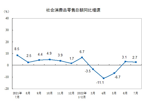 智通财经APP获悉,8月15日,国家统计局发布的数据显示,7月份,社会消费品零售总额35870亿元,同比增长2.7%。其中,除汽车以外的消费品零售额32046亿元,增长1.9%。1—7月份,社会消费品零售总额246302亿元,同比下降0.2%。其中,除汽车以外的消费品零售额221332亿元,增长0.2%。