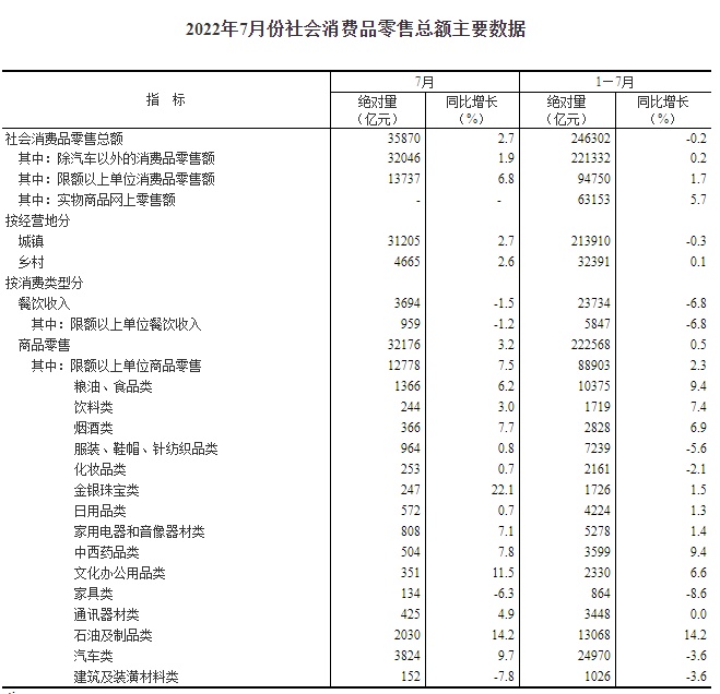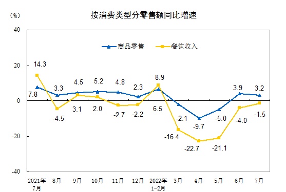 按消费类型分,7月份,商品零售32176亿元,同比增长3.2%;餐饮收入3694亿元,下降1.5%。1—7月份,商品零售222568亿元,同比增长0.5%;餐饮收入23734亿元,下降6.8%。