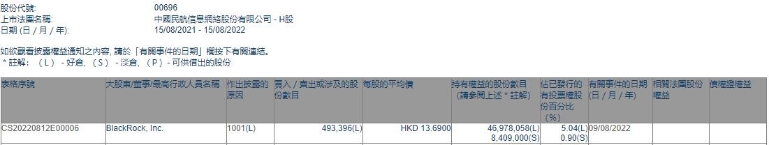 智通财经APP获悉,香港联交所最新资料显示,8月9日,贝莱德增持中国民航信息网络(00696)49.3396万股,每股作价13.69港元,总金额约为675.46万港元。增持后最新持股数目约为4697.81万股,最新持股比例为5.04%。