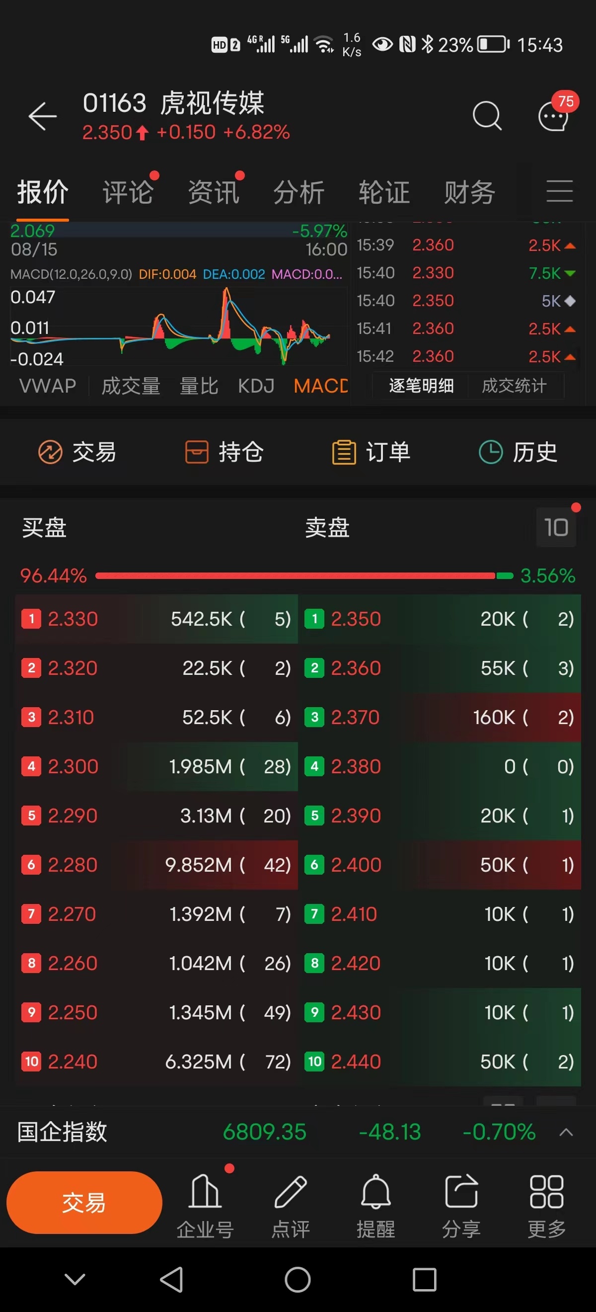智通财经APP获悉,虎视传媒(01163)尾盘放量跳水,跌幅约11%,全日振幅高达22%以上。盘口信息显示,跳水期间委买大单快速撤离。截至收盘,虎视传媒跌10.91%,报1.96港元,成交额放出惊天1.65亿港元巨量,换手率接近12%。
