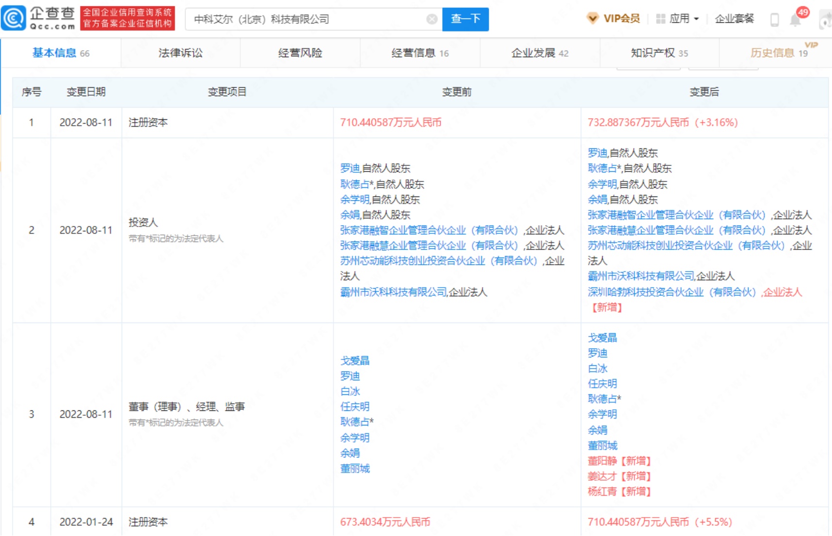 智通财经APP获悉,企查查APP显示,中科艾尔(北京)科技有限公司(下称:中科艾尔)于近日发生工商变更,新增华为关联公司深圳哈勃科技投资合伙企业(有限合伙)为股东,同时公司注册资本由710.44万元人民币增加至732.89万元人民币,增幅3.16%。据公开资料显示,中科艾尔成立于2008年,是一家半导体电抛光技术高端产品与核心解决方案的专业服务商。经营范围包含:通讯设备、电子产品、橡胶制品;专业承包等。