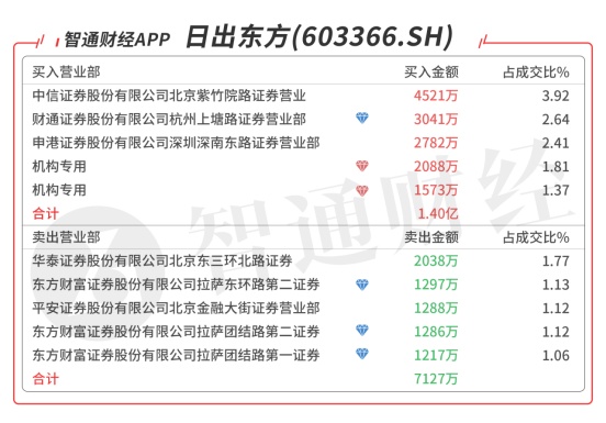 日出东方(603366.SH):多主力现身龙虎榜,2家机构席位合计买入3661万元,买二是知名游资上塘路的席位买入3041万元,当日净买入6878万元,该股如突破近期高点,可看高一线。