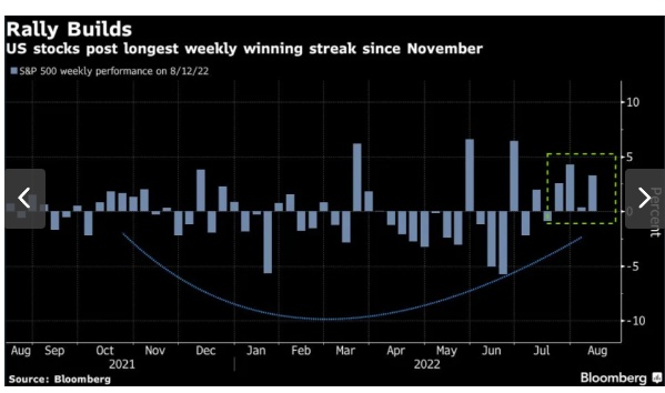 自今年6月中旬以来,这种乐观情绪在投资者中变得更加普遍,因为二季报比预期要好得多,而且数据显示失控的通胀略有下降。截至上周,标普500指数已连续第四周上涨,这是自去年11月以来最长的连涨。