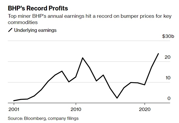 智通财经APP获悉,周二,全球最大的矿业公司必和必拓(BHP.US)公布了截至6月30日的2022财年业绩,其中,受益创纪录的大宗商品价格,该公司全年利润创下历史新高,并表示将在中国需求前景更加强劲的预期下推进扩产计划。