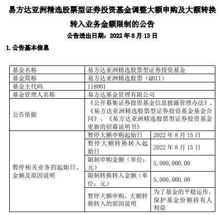 公告显示,易方达亚洲精选股票申购单日单账户不超100万元调整至单日单账户不超500万元,大额申购额度上限放宽5倍。