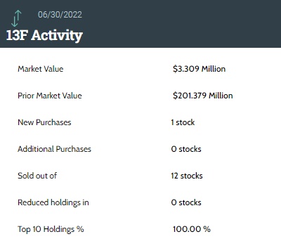 根据美国证券交易委员会(SEC)披露,Micheal Burry旗下这家资产管理公司递交了截至2022年6月30日的第二季度(Q2)持仓报告(13F)。该资产管理机构第二季度持仓总市值仅为330.9万美元,相比之下上一季度持仓总市值为2.01379亿美元。该机构在第二季度的持仓组合中新增了1只个股,清仓12只个股。其中前十大持仓标的占总市值比例为100%。