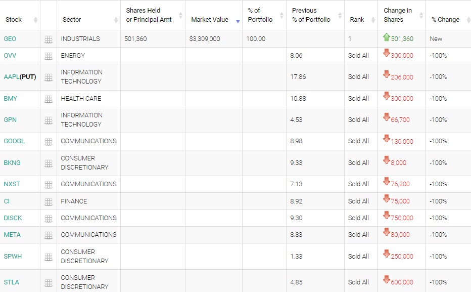 周一提交给监管机构的13F文件显示,该机构第二季度抛售了包括Booking(BKNG.US),谷歌母公司Alphabet(GOOGL.US)和Facebook母公司Meta Platforms(META.US)在内所有美股持仓,仅仅增持且持有一只美股——私人监狱运营商Geo Group Inc.。