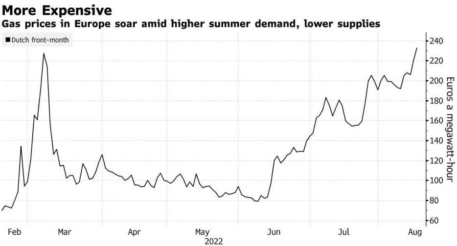 智通财经APP获悉,欧洲炎热的夏季导致天然气需求高于正常水平,加剧了可能将主要经济体推入衰退的能源危机,天然气价格延续上涨势头。截至发稿,基准期货价格上涨6.5%,周一收涨6.8%。炎热干燥的天气导致河流水位迅速下降,阻碍了能源大宗商品的运输。在来自俄罗斯的天然气供应继续受到限制的情况下,这可能会迫使公用事业公司使用更多的天然气作为替代。