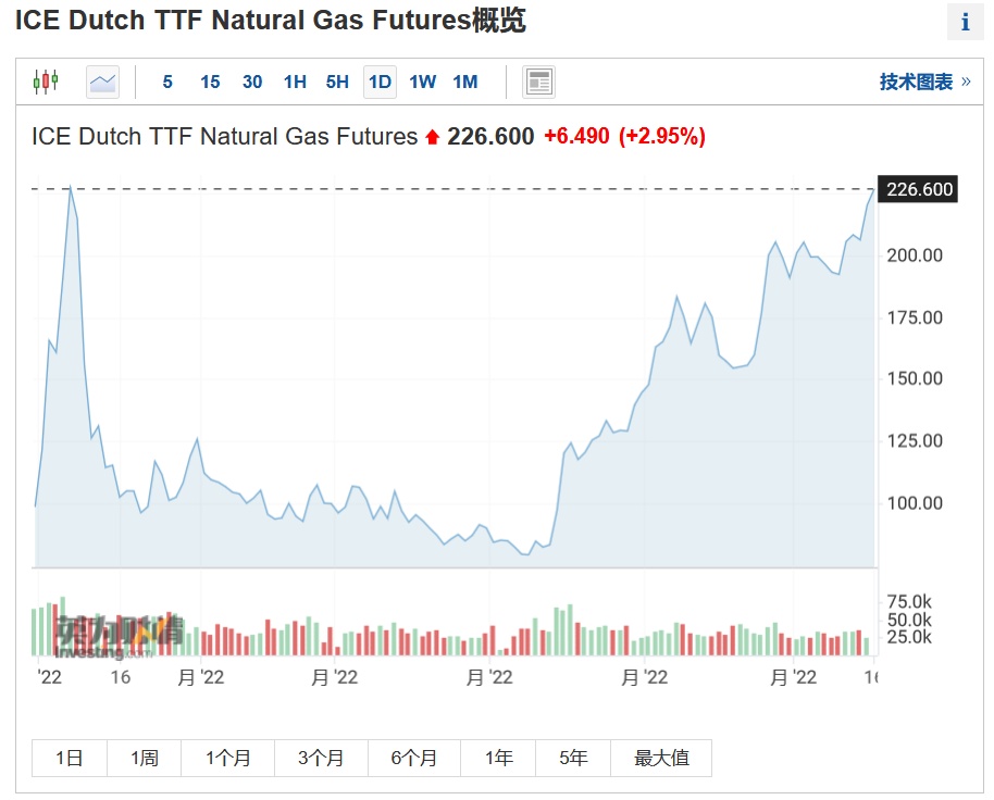 欧洲天然气价格继续走高。截至发稿,欧洲基准荷兰近月天然气期货价格上涨2.95%,至226.60欧元/兆瓦时;日内早些时候一度飙升6.5%,创3月初以来最高盘中价格。
