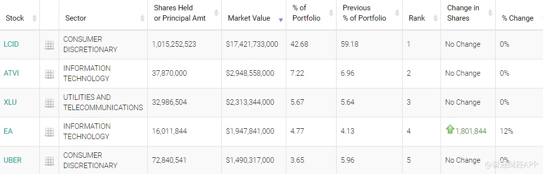 在前五大重仓股中,Lucid(LCID.US)仍位列第一,持仓市值约174.22亿美元,占投资组合比例为42.68%。
