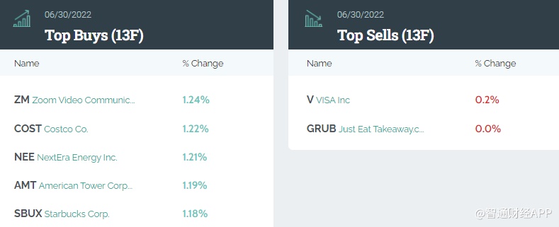 从持仓比例变化来看,前五大买入标的分别是:Zoom视频通讯(ZM.US)、好市多(COST.US)、新纪元能源(NEE.US)、美国电塔(AMT.US)、星巴克(SBUX.US)。这些个股均为新增持股。