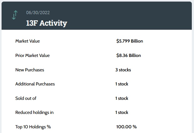 据统计,凯雷第二季度持仓总市值为57.99亿美元,上一季度总市值为83.6亿美元,环比下降30.6%。凯雷在第二季度的持仓组合中新增了3只个股,增持了1只个股,减持了1只个股并清仓了1只个股。其中前十大持仓标的占总市值的100%。