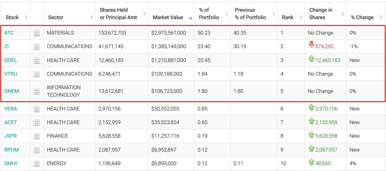 在前五大重仓股中,全球最大电镀公司Atotech Limited(ATC.US)位列第一,持仓约1.54亿股,持仓市值约29.74亿美元,占投资组合比例为50.23%,较上季度持仓数量无变化。