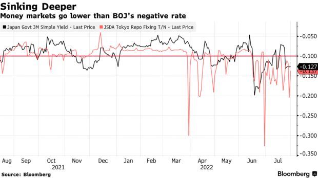 然而,最近几周,回购利率和短期日本国债利率比日本央行的-0.1%利率更深地进入负区间,原因是资金在全球通胀担忧导致收益率上升的情况下流入短期产品。瑞穗财政部门联席总经理Takuo Miwa表示,这使得把资金存放在央行“在经济上是合理的”。