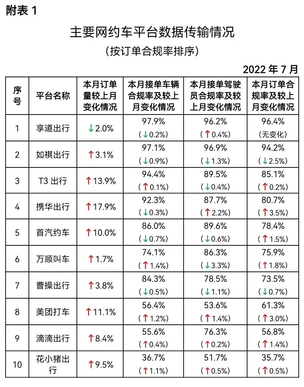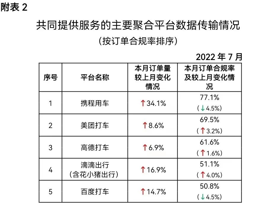 其中,面向乘客、与网约车平台公司共同提供服务的平台(俗称“聚合平台”)完成1.53亿单,按订单合规率由高到低的分别是携程用车、美团打车、高德打车、滴滴出行(含花小猪出行)、百度打车。
