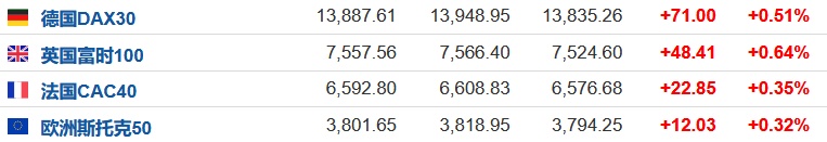2. 截至发稿,德国DAX指数涨0.51%,英国富时100指数涨0.64%,法国CAC40指数涨0.35%,欧洲斯托克50指数涨0.32%。