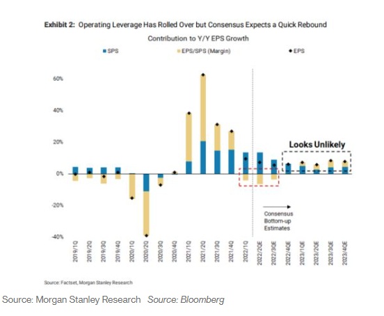 尽管最近一个季度,多数行业的营收增长强劲,但多数行业的运营杠杆(每股收益增长减去销售增长)为负值。摩根士丹利预计这一趋势将持续下去,尽管市场普遍认为利润率将在2023年扩大。
