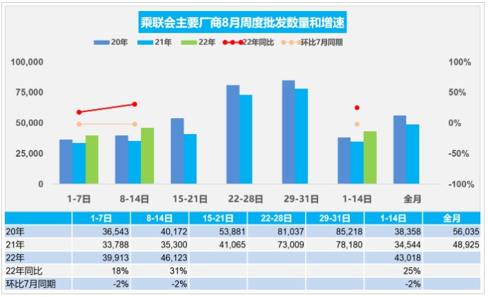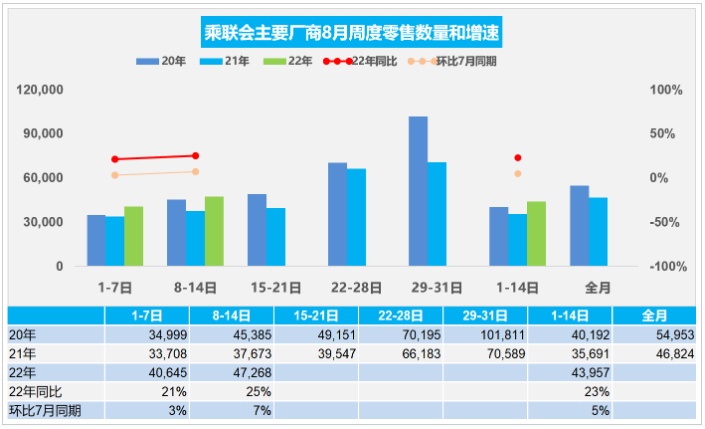 今年8月第二周总体狭义乘用车市场零售达到日均4.7万辆,同比2021年8月第二周增长25%,相对今年7月第二周均值微增7%。8月1-14日全国乘用车零售61.5万辆,同比去年增长23%,较上月同期增长5%。