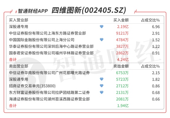 四维图新(002405.SZ):多主力现身龙虎榜,深股通大单对倒净买入1.6亿元,买三是量化基金的席位买入4522万元,当日净买入2.53亿元,该股今日强势涨停,后期走强需持续放量。