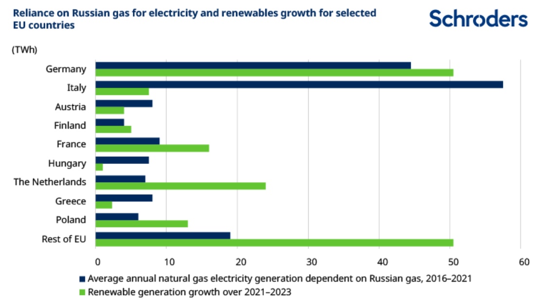 下面的图表强调了可再生能源如何成为解决天然气短缺的一部分。图表中蓝色的部分显示了部分欧盟国家依赖俄罗斯天然气每年发电的平均比例,而绿色部分代表了2021-23年期间预计的可再生能源增长。