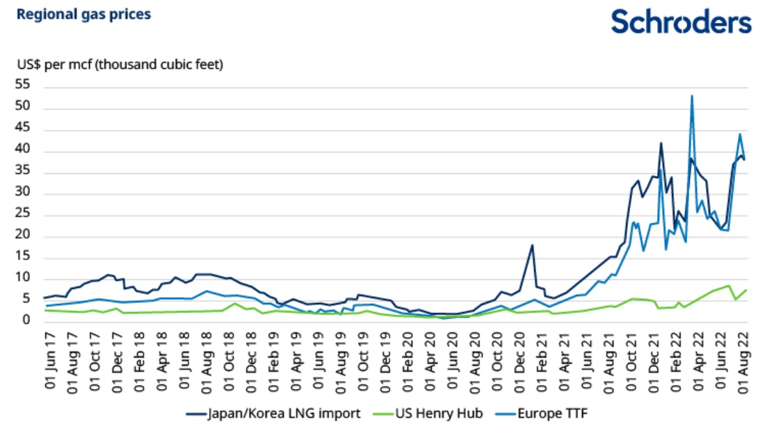 全球资源股票主管Mark Lacey表示:“欧洲正面临18至24个月的非常高的天然气价格和电力价格期。在此期间,欧洲已成为并将继续是天然气的溢价市场,价格高于亚洲或美国。这种溢价将持续到2024/25年我们开始看到有意义的新流量投产为止。”