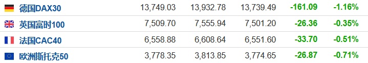 2. 截至发稿,德国DAX指数跌1.16%,英国富时100指数跌0.35%,法国CAC40指数跌0.51%,欧洲斯托克50指数跌0.71%。