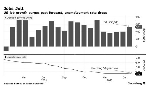 美国劳工部8月5日公布的一份报告显示,上个月美国企业新增雇员52.8万人,是预测者预期的两倍多,这促使投资者押注美联储将在9月20日至21日的会议上连续第三次加息75个基点。